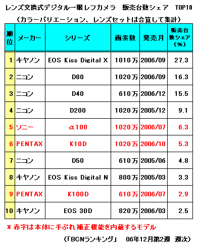 機種別のランキングに戻ろう。ニコンの「D40」とほぼ同時期に発売し、11月最終週には3位にランクインしたペンタックスの「K10D」だったが、12月第2週には6位にランクダウン。台数シェアは5.3%にとどまった。