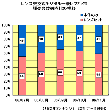 購入者層が、フィルムカメラからの「乗り換え組」と、コンパクトデジカメからの「ステップアップ組」に分けられるデジタル一眼。ボリュームが大きいのはステップアップ組と見られる。例えば、ボディのみとレンズセットの販売構成比を見ると、レンズセットが64.3%を占める。06年7月から06年11月までの月次の台数構成比推移でも、レンズセットは60%前後で推移している。必ずしもこの全てとはいえないが、かなりの部分は「初めての一眼レフ購入」ではないかと思われる。