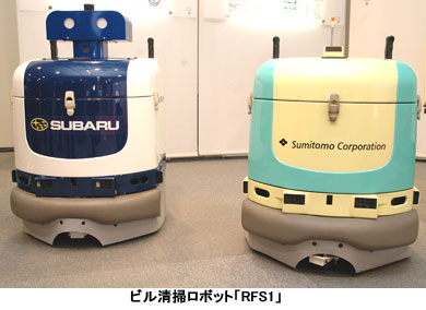 「RFS1」はオフィスビルの床を掃除するロボット。清掃時間や場所を設定するとロボットが格納場所から自動で発進し掃除を開始する。作業後はスタート位置に自動的に戻る。コンピュータとセンサーを搭載し、障害物を検知・回避しながら作業を行う。また、光ファイバージャイロを利用した方向検出機能と、車輪からの走行距離検出機能を使って自らの位置を確認しながら走行することができる。