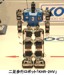 「KHR-2HV」は高さ183×幅353mmで、17の駆動軸で滑らかな動きが特徴。転倒しないようジャイロセンサーを内蔵する。本体は軽量アルミ合金フレーム製。電源にはニッケル水素バッテリーを使用し、10-15分程度の稼動が可能。側転をしたり、ボールを蹴るといった動作もできる。価格はオープンで、実勢価格は9万円程度。近藤俊博社長は「遊びだけでなく、研究や教育用といった用途にも展開していきたい」と今後の抱負を述べた。