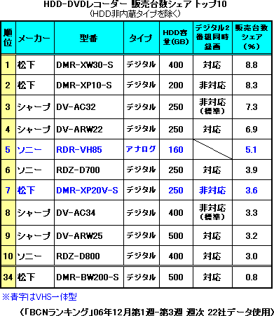 年末商戦の売れ筋第1位は、松下の「DMR-XW30」が獲得した。販売台数シェアは8.8%。2位には、1位とわずか0.5%差で、同じ松下のエントリーモデル「DMR-XP10」がランクインした。3位・4位はシャープの新旧2製品7.3%で「DV-AC32」、6.9%で「DV-ARW22」が続く。ここまではすべてデジタルチューナーを内蔵した地デジ対応モデルが占めた。5位にようやく、地上アナログ・BSアナログチューナー内蔵のアナログ専用モデル「RDR-VH85」がシェア5.1%で登場する。上位10位以内のアナログレコーダーは、ソニーのこの1機種のみ。注目の次世代機は、松下のBDレコーダー「DMR-BW200」の34位、0.8%が最高位。今のところ出足は鈍い。
