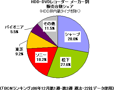 06年の注目はシャープだ。今年に入って急激にシェアを伸ばしている。とくに年末商戦に入ってからの伸びが著しい。背景には、液晶テレビの好調と、テレビと合わせた指名買いの増加が挙げられる。「AQUOSファミリンク」でテレビなどとの接続を簡単にした工夫が功を奏しているようだ。利便性の向上と同時に囲い込みを狙うメーカー、客単価を上げたい店、商品選択や設定の手間を嫌う消費者の三者三様の思惑が一致した。ただ、テレビとレコーダーのメーカーを揃えてメリットある「AQUOSファミリンク」に対応しない機種も上位に入っており、一概に同時購入ばかりともいえないようだ。松下と比べると、標準でチャプター作成機能を備えるなど、ある程度の編集機能を持ち、トータルバランスがいい。