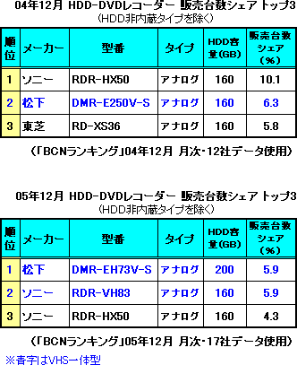 過去2年を振り返ると、年末商戦でデジタルチューナーを搭載した地デジ対応モデルが主役になったのは実は今回が初めて。04年は製品自体は出回っていたが、今年の次世代HDD-DVDレコーダーのように、順位は下のほう。05年でも地デジ対応モデルは、5位が最高。アナログ専用モデルでは、VHS一体型の3in1機が上位に多くランクインしていた。