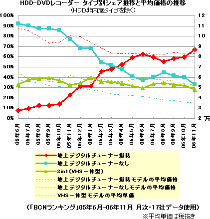 店頭からHDD-DVDレコーダーのアナログモデルが徐々に姿を消し始めた。11月には地上デジタル放送(地デジ)対応率が67.2%と7割近くまで高まり、9割に達している薄型テレビの「地デジ化率」を追いかける。デジタル対応となると、ハイビジョンコンテンツの録画も増え、売れ筋の傾向にも影響を与えそうだ。さらに薄型テレビなどとの接続を簡単にする「リンク機能」など、HDD-DVDレコーダーに求められる機能が少しずつ変化している。そこで、この年末商戦を「BCNランキング」の12月速報値で切り出し、最新動向をまとめた。