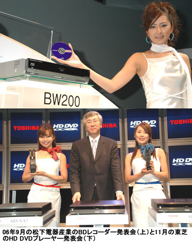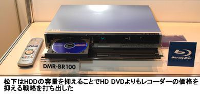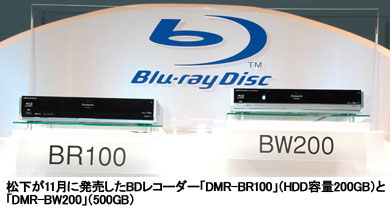 東芝のプレーヤー発売から遅れること8か月、BD陣営では松下が「DMR-BW200」「DMR-BR100」を11月に発売。「録画映像をHDDに仮置きし、すぐにBDに保存してもらう使い方を想定し、HDD容量を抑えた」(杉田卓也・ビデオビジネスユニットビジネスユニット長)ことで、東芝のHD DVDレコーダーよりも実勢価格を安く設定、価格面で勝負を仕掛けた。