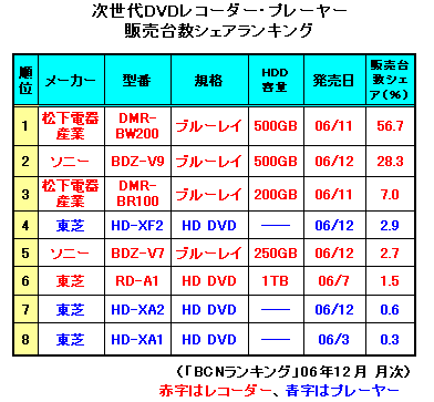 「BCNランキング」では、次世代DVD機を、DVDレコーダーとDVDプレーヤーのカテゴリに分類している。12月のDVDレコーダーとプレーヤーを合計した販売台数に占める次世代機の割合はわずか0.6%。現行のDVDレコーダーに比べると、市場規模はきわめて小さく、まだまだこれからの市場といえる。
