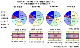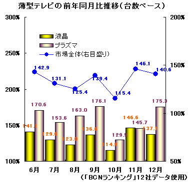 薄型テレビの年末商戦は06年11-12月にピークを迎え、06年11月の販売台数は前年同月比で146.1%。同年12月は140.6%だった。06年12月のタイプ別の販売台数では、液晶テレビが同137.1%、家電量販店の売り場を拡大するなどして拡販に努めたプラズマテレビは同175.3%に達した。これはワールドカップ需要で盛り上がりを見せた6月の液晶テレビ同141.1%、プラズマテレビ同170.6%に並ぶ水準。