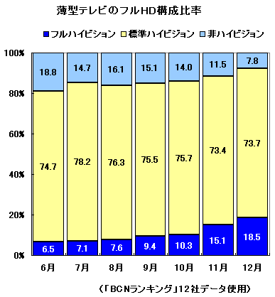 さらにフルハイビジョン(フルHD)化も進んでいる。液晶テレビ、プラズマテレビを合算した薄型テレビ市場全体で、フルHDモデルが占める台数シェアは06年12月で06年6月の約3倍の18.5%にのぼる。また、フルHD化がより進んでいるのは液晶テレビ。タイプ別のHD化率は液晶テレビが19.8%、プラズマテレビは8.3%だった。