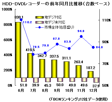 一方HDD-DVDレコーダーでは、薄型テレビなどと連携できるリンク機能搭載モデルの人気が高まった。06年ピークの11月でも前年同月比94.8%、12月も同84.8%と前年割れの水準。販売金額でも11月が同100.6%、12月が同84.6%にとどまった。