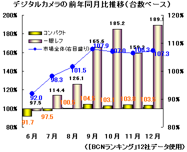 デジタルカメラ市場は、06年8月を境に前年同月比プラスで推移している。年末商戦期の9-12月の販売台数は平均して前年同月比で107%。なかでも一眼レフカメラは大きく伸び、06年12月には同189.1%と、06年最大の伸び率をマークした。また06年夏まで前年実績を下回っていたコンパクトカメラも、一眼レフカメラにつられる形で健闘。06年12月には同103.5%と前年並みの水準に回復した。