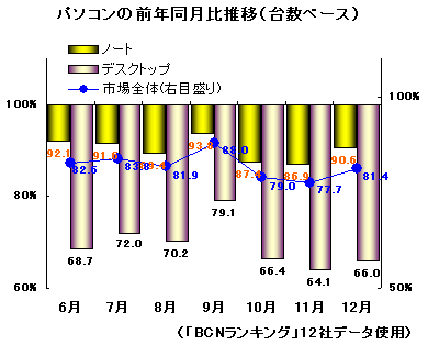 サッカーワールドカップをはじめとしてスポーツイベントの多かった06年。テレビを中心とするAV家電にパイを奪われてしまったのがPC市場だ。年間を通じて前年実績を超えることができない水面下の展開が続いた。特に9-12月の販売台数は平均して前年同月比80%前後で2ケタ減のまま推移。06年12月のタイプ別販売台数では、ノートPCがかろうじて同90.6%と1ケタ台の減にまで戻してきたが、デスクトップPCの伸び率は同66.0%と低水準だった。