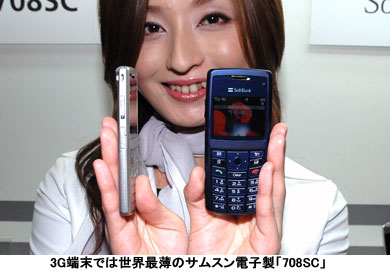 薄型端末で目玉となるのが、W-CDMA方式の第3世代(3G)携帯電話では、厚さが8.4mmと世界最薄の「708SC」(韓国サムスン電子製)。メインに有効200万画素のCMOSカメラを搭載。WordやExcel、PowerPointのファイルが閲覧できるドキュメントビューワー、英語・中国語・韓国語の翻訳機能も備える。