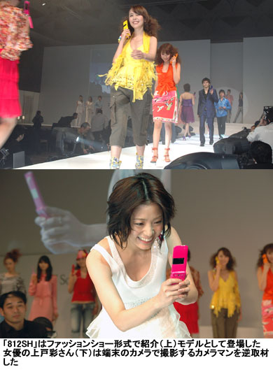 発表会ではモデルを使ってファッションショー形式で端末を紹介。端末の持つファッション性の高さをアピールした。女優の菊川怜さんと上戸彩さんもモデルとして登場。菊川さんは「私は一番はグリーン、次に黄色の端末が好きです」、上戸さんは「ビビッドのピンクがかわいいと思った」と、端末についての感想を語った。