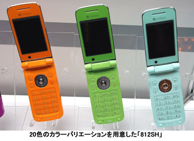 春商戦モデルで孫社長が、もう1つこだわったのが「ファッション」。そのコンセプトを元に開発したのがシャープ製の薄型端末「812SH」で、1機種では世界最多の20色のカラーバリエーションで発売する。例えばブルー系だけでも「ブルー」「ライトブルー」「ネイビー」など複数色を揃えた。