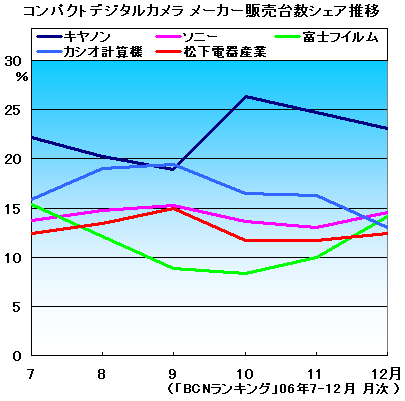 「BCNランキング」の月次データでコンパクトデジタルカメラのメーカー別販売台数シェアを見ると、松下は06年9月の15%をピークに11月には11.7%まで下落。12月にはやや持ち直したものの12.3%にとどまっている。一方、「顔認識」機能を搭載した機種を年末商戦に投入した富士フイルムは、10月の8.3%を底に12月には14.1%までシェア拡大させている。メーカー別シェアでトップのキヤノンも、「顔認識」機能を搭載した機種を発売。10月の26.3%をピークにから年末にかけシェアを落としたが、12月でも23.1%と依然高いシェアを保っている。