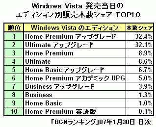 Windows Vista 発売初日に最も売れたのは「Home Premium」アップグレード版