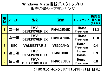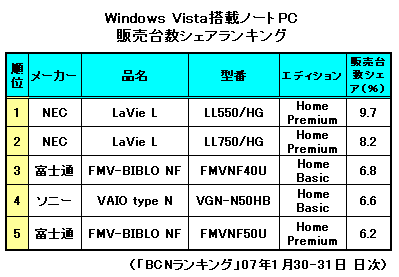 Vista商戦開戦2日、売れ筋PCはデスクトップで富士通、ノートでNECとソニー