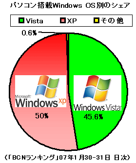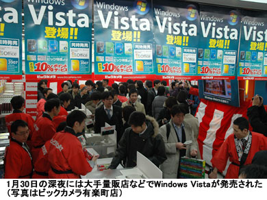 デスクトップとノートを合わせたパソコン全体で発売直後の2日間の動向を見ると、Vista搭載パソコンの販売台数シェアはすでに45.6%。市場のほぼ半分が新OSに切り替わった。量販店では「『Vistaしかない』と待っていた人が平日にもかかわらず大勢パソコンを買いに来ている」(ビックカメラ)、「夕方以降、閉店まで、ビジネスマンを中心とした人たちが購入に訪れ、予想以上の売れ行き」(エディオン)だという。