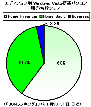 ここでパソコンに搭載されたVistaのエディション別シェアを見てみよう。デスクトップとノートを合わせた全体で「Home Premium」が60%で、次に「Home Basic」が36.7%、3番目が「Business」で3.3%だった。