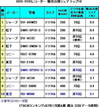 07年1月第4週(07年1月22日-28日)の「BCNランキング」DVDレコーダー機種別販売台数ランキング1位は、シャープの「DV-ARW22」が初めて獲得。2位は松下「DMR-XP10」、3位は再びシャープの「DV-AC32」、4位は松下「DMR-XW30」と、シャープと松下の2社が交互に並んだ。シャープ、松下、いずれの製品とも片方が価格の安いエントリーモデルで、もう片方がそのワンランク上の普及モデル。シェアは1位の「DV-ARW22」が9.3%、2位の「DMR-XP10」が8.4%で、差はわずかに0.9ポイント。3位と4位はさらに僅差で、「DV-AC32」が6.4%、「DMR-XW30」が6.3%という大接戦だった。
