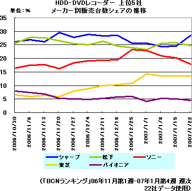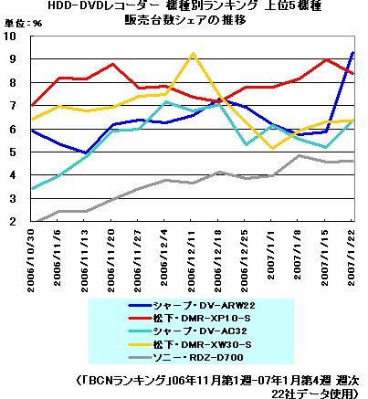 06年11月以降、今週1位から4位に入ったシャープ・松下の計4機種は、常に上位5位以内につけ、激しいシェア争いを繰り広げていた。もっともトップの座は、当初の「DMR-XP10」を同じ松下の「DMR-XW30」が逆転、さらに「DMR-XP10」が再浮上と、松下の独壇場だった。そこへシャープの「DV-ARW22」が急浮上してトップを奪った形だ。