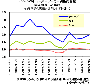 メーカー別で販売台数の前年同週比を見ると、両社の強さがより鮮明になる。HDD-DVDレコーダー市場全体では前年並みか前年割れの水準が続いていたにも関わらず、松下は1.2-1.5倍、シャープに至っては1.4倍から最大3倍と、それぞれ前年を大きく上回った。