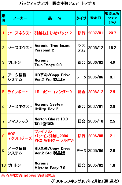 トップ10のなかでもVistaに対応する製品はさすがにまだ少ないが、1位の「引越おまかせパック 2」が対応しているほか、シェア2.9%で5位に登場しているライフボートの「LB コピーコマンダー9」もVistaに対応する。06年12月発売の「総合」タイプで、Windowsを起動したままOSやアプリケーション、HDDのデータをリムーバブルディスクや外付けHDDに移行できるのが特徴。差分コピーにも対応する。HDDやHDD内のパーティションに含まれるデータを、他のHDDに直接コピーするので、Linuxの環境などが含まれていてもそのままコピーできる。価格は6300円。このほか、8位にはAOSテクノロジーズの「ファイナルパソコン引っ越し2006 PRO 専用ケーブル付き」が、シェア2.1%でランクイン。06年5月発売ながら、無料最新バージョンをダウンロードすればWindows Vista対応になる。