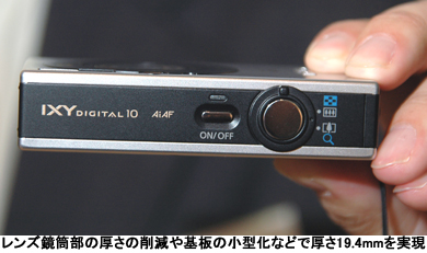 「IXY DIGITAL 10」は薄型化を追求。シャッターやレンズユニットの見直しでレンズ鏡筒部の厚さを削減し、基板の小型化や内蔵ストロボのレイアウトを変更することで、従来機種よりも2.3mm減の厚さ19.4mmを実現した。カラーは、フロントカバーのレンズ部分と鏡筒側面部分の色が異なるブラックとシルバーの2色。