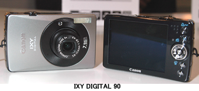 「IXY DIGITAL 90」は、モニターに約23万画素の3.0型クリアライブ液晶を装備。指を置くとセンサーが感知し、液晶モニターに操作部分のアイコンが表示されるタッチホイールを搭載したほか、撮影モードと再生モードをすばやく切り替えることが可能な独立再生ボタンを採用するなど、使い勝手の向上を図った。