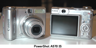 「PowerShot A570 IS」は、前モデル「A570」の後継機種で、有効710万画素のCCDと、35ミリフィルムカメラ換算で35-104mmの光学4倍ズームレンズを搭載。レンズシフト式手ブレ補正機構を新たに装備した。