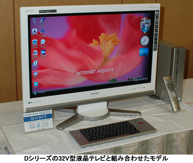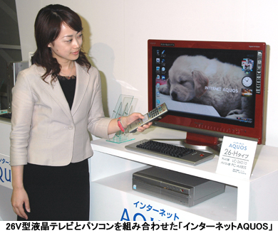 同社は06年5月に初代の「インターネットAQUOS(アクオス)」を発売した。液晶テレビのサイズは37V型と32V型。量販店などでは、パソコン売り場とテレビ売り場で販売していた。しかし、テレビ売り場では薄型テレビの急速な価格下落の影響で「PCが付いているだけで、(大型テレビとしては)割高となり販売に苦戦した」(同)。さらに「パソコン売り場では大型テレビは厳しい」(同)と、いずれも売り場でも中途半端な位置づけに終わった。そのため今回は、中小型液晶テレビとのセットで、パーソナル需要を開拓することにした。新製品も初代モデル同様、テレビ売り場とパソコン売り場に並ぶ予定だが、「かなりの部分をパソコン売り場で販売する」(同)方針。
