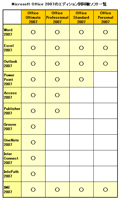 まず、エディション別の同梱ソフトを確認しておこう。「Personal」は、Word 2007、Excel 2007、Outlook 2007の3本のみで、個人向けの最も基本的な構成。「Standard」は、PersonalにPowerPoint 2007が加わったビジネス向け基本タイプ。「Professional」は、Standardにデータベースを構築できるAccess 2007、パンフレットやウェブページが作成できるPublisher 2007の2ソフトを追加したビジネス向けの上級タイプ。「Ultimate」は、Professionalにファイル、スケジュールの共有ができるGroove 2007、テキストや画像、ウェブページやメモなどを保存しておけるOneNote 2007、名刺管理や人とのやり取りを記録できるInterConnect 2007、経費精算や休暇申請などの提携業務を行えるInfoPath 2007の4ソフトを盛り込んだオールマイティータイプだ。また、いずれのエディションにもOffice IME 2007を同梱する。