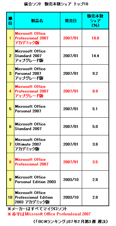 それでは「BCNランキング」07年2月第3週(2月12-18日)の週次データで、統合ソフトの販売本数シェアトップ10を見てみよう。シェア18%で1位になったのは「Microsoft Office Professional 2007 アカデミック版」。マイクロソフトが発表する参考価格は3万4440円。アカデミック版の対象者は、教育機関で働く職員または学生、生徒、児童で、製品購入時に身分証を提示すると、通常のほぼ半額で購入できる。例えば、同Professionalの通常版は6万2790円。アカデミック版の方が2万8350円お得になる計算だ。