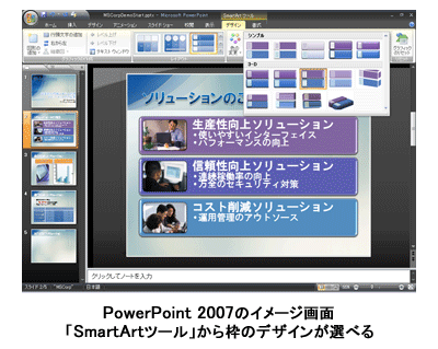 また、Word、Excel、Outlook、PowerPointなどアプリケーションの種類をまたいで、美しく統一感のある文書・図表・スライドを作成できるようになったのも特徴。配色・フォント・効果の3つを組み合わせた「テーマ」からデザインを選択すれば、異なるアプリケーションの書類でも統一したデザインで仕上げることができる。「テーマ」は「キュート」「クール」「ビジネス」など全部で24種類。デザインだけでなく図表の種類も豊富になり、相関図、プロセス図、ドーナツ型図表など「SmartArtグラフィック」機能で一覧から選択できる。