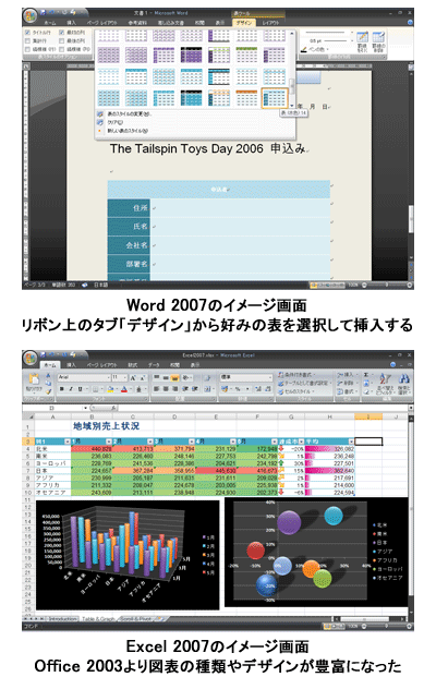 さて、Office 2007はOffice 2003と比べてどこがどのように新しくなったのか、簡単に見ていこう。まず、全ソフト共通で改善されたのは、直感的な操作ができるようになった点だ。「リボン」と呼ばれる横長のインターフェイスをウィンドウの上部に採用し、「ホーム」「挿入」「ページレイアウト」などの作業目的別カテゴリにはタブを採用。必要なタブを選択すれば機能が一覧で表示されるので、使いたい機能が選択しやすい。