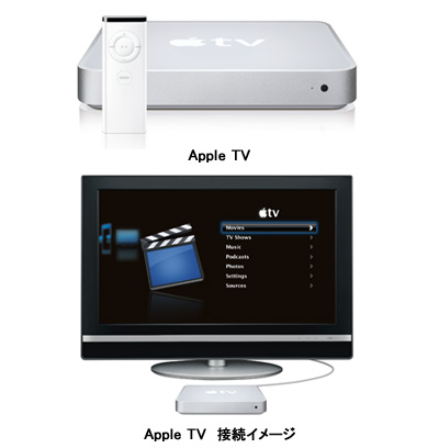 「Apple TV」は、有線LANや無線LANを利用し、コンピュータに保存されている「iTunes」のコンテンツをテレビで再生可能なプレーヤー。1つのコンピュータからテレビにコンテンツをオートシンク(自動同期)することができ、付属の赤外線リモコン「Apple Remote」を使うと、最長9メートル離れた場所からでも操作できる。