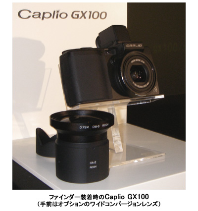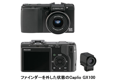 リコーは3月28日、脱着式のファインダーを備え、35ミリフィルムカメラ換算で24-72mmの光学3倍ズームレンズを搭載するコンパクトデジタルカメラ「Caplio(キャプリオ) GX100」を、4月20日に発売すると発表した。価格はオープン。実勢価格は8万円前後の見込み。