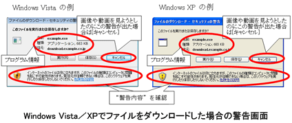 IPAでは、写真や動画に見せかけてホームページ上で置かれたワンクリック不正請求画面を表示するウイルスなどの悪意あるプログラムをクリックすると、プログラムをダウンロードし、当該プログラムを実行するかどうか警告する画面が表示されるため、こうした場合には「キャンセル」をクリックし、先に進まないよう警告している。