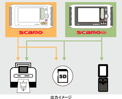 「scamo」は、PictBridge対応プリンタへの直接出力と、SDメモリカードへの保存に対応。さらに「scamo beam」は赤外線送信機能を搭載し、画像データをワイヤレスで携帯電話に送信することもできる。本体サイズは幅303.5×奥行き170.0×高さ32.5mm、重さは約620g。