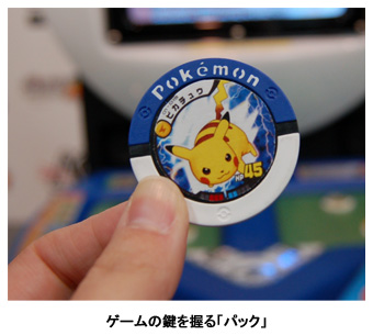 現在、子ども向けのアーケードゲームは、カードのデータを読み込んで遊ぶものが主流。それに対して「ポケモン バトリオ」は、直径40mm、厚さ3.4mmの円盤型の「パック」を使うのが特徴。パックには、ゲームキャラクターのデータを記録できるだけでなく、パックを動かすことでゲーム画面のキャラクターを直接操作することもできる。