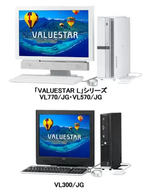 実勢価格は20型ワイド液晶、SDメモリーカード、メモリースティック、xDピクチャーカード対応スロット、500GBのHDDを搭載し、地上デジタルTVチューナー搭載モデルの「VL770/JG」が29万円前後、TVチューナー非搭載モデルの「VL570/JG」が23万円台半ば。17型液晶を採用したスリムタイプの「VL300/JG」は18万円前後の見込み。