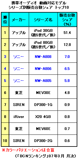 07年3月のデータで、携帯オーディオの動画対応モデルに限った販売台数シェアトップ10を見ると、06年9月発売の第5世代iPod 30GBモデルが51.4%で1位だった。なお、カラーバリエーションは合算して集計した。新第5世代iPodは、発売翌月の06年10月に55.1%、06年12月から07年2月の間は60%前半をキープしていた。2位は12.8%で同じく新第5世代iPodの80GBモデル。いずれも2.5型液晶ディスプレイを備えたHDDタイプだ。