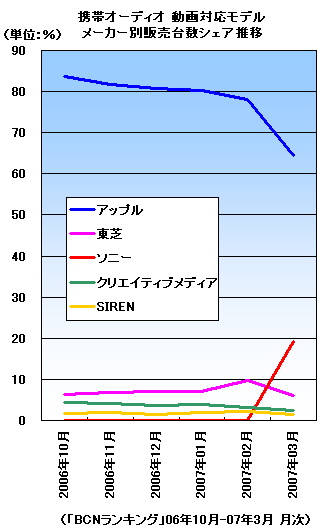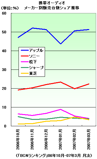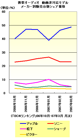 またメーカー別では、06年10月-07年3月の販売台数シェア推移はアップルが50%前後で他社を引き離してトップを維持。その後をソニーが20%前後を保っており、アップル・ソニーの2強構造は続いている。3位以下は一桁台で松下、シャープ、東芝が争う形となっており、大きな構造の変化は見られない。