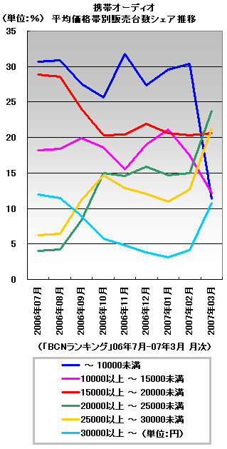 最後に、携帯オーディオの価格のトレンドをチェックしておこう。06年7月-07年3月の平均価格帯別販売台数シェア推移を見ると、1万円未満の安価なモデルが07年2月まで25-30%を推移して人気だったが、直近の3月では11.3%まで落ち込んでいる。1万5000円-2万円のモデルも同様、ピーク時の28.9%から06年10月以降は20%前後で横ばい状態。