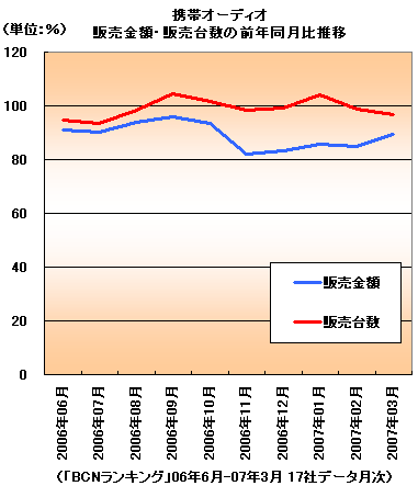 それでは、携帯オーディオ市場全体の動きはどうなっているのだろうか。06年6月-07年3月の販売金額・販売台数の前年同月比推移を見ると、06年6月の時点ではすでに前年割れの水準になっており、以後、販売台数は100%前後、販売金額は80%後半から90%で推移している。一頃の拡大路線は一段落している状況だ。