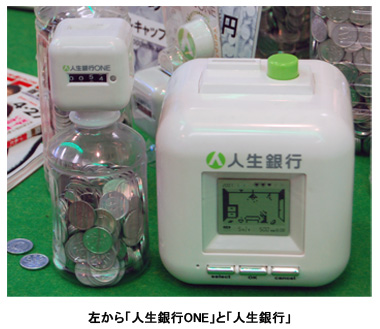対応するペットボトルは、500mlのものから、ミニボトル、大型ボトルまでと幅広い。また「人生銀行」オリジナルの「人」の文字をデザインしたボトルキャップを付属し、硬貨でいっぱいになったペットボトルの口を閉めることができる。価格は999円。この中途半端な価格設定について、同社の担当者は「1000円札で(「人生銀行ONE」を)購入して、おつりの1円から貯金をスタートしてほしい」と狙いを語った。