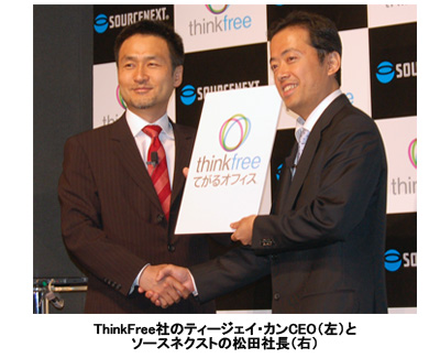 ソースネクスト(松田憲幸社長)は5月14日、米ThinkFree社と提携し、Web上で利用できる無料オフィスソフト「ThinkFree てがるオフィス」のβ版の公開を同日から開始したと発表した。9月には正式版の公開を行う予定。松田社長は「08年9月までに100万人、10年9月までに400万人の登録ユーザーを獲得する」と意気込みを語った。