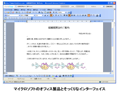 ThinkFree社の無料オンラインオフィスソフト「ThinkFree Online」を日本語化したもの。専用のソフトをインストールすることなく、Web上でワープロ、表計算、プレゼンテーション機能を利用することができる。なお、β版では一部英語表記が残っているが、正式版ではすべて日本語化する。