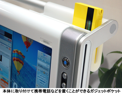 重さは4kg。本体背面には、大型の取っ手が設けられており、片手で持ち運ぶことが可能。「個室からリビングへと手軽に動かして使えることも魅力」(同)だという。また、携帯電話やCDなどを置くことができるプラスチック製のガジェットポケットが付属しており、本体と取っ手部分に取り付けて利用することもできる。
