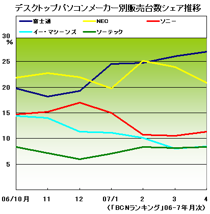 一方、デスクトップパソコンのメーカー別販売台数シェアを見ると、4月は富士通が26.9%でトップ。NECは20.9%で2位だった。1月のWindows Vista発売以降、富士通はデスクトップPC「FMV-DESKPOWER」で、1月に発売したWindows Vistaを搭載の第1弾モデル「LX」や「CE」「EK」がまんべんなく人気を集め、1月以降シェアを伸ばした。